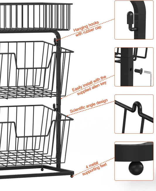 3-Tier Fruit Basket Fruit Bowl for Kitchen Counter or Floor,Fruit Holder Produce Basket for Fruits,Vegetables and Snacks,Metal Market Basket Storage Stand