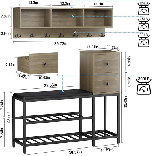 39" Entryway Coat Rack Shoe Bench with 2 Drawers and 3 Cubbies, 7-in-1 Entryway Bench Hall Tree with Bench and Shoe Storage, Coat Rack with 7 Coat Hooks & 2 Umbrella Stands(Wood)