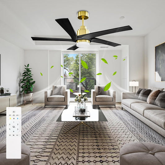 52 Inch Ceiling Fans with Lights and Remote Control, Stepless Dimmable, DC Ceiling Fan with 5 Reversible Black Blades & Brass Finish, for Indoor & Outdoor, 3CCT, ETL Listed