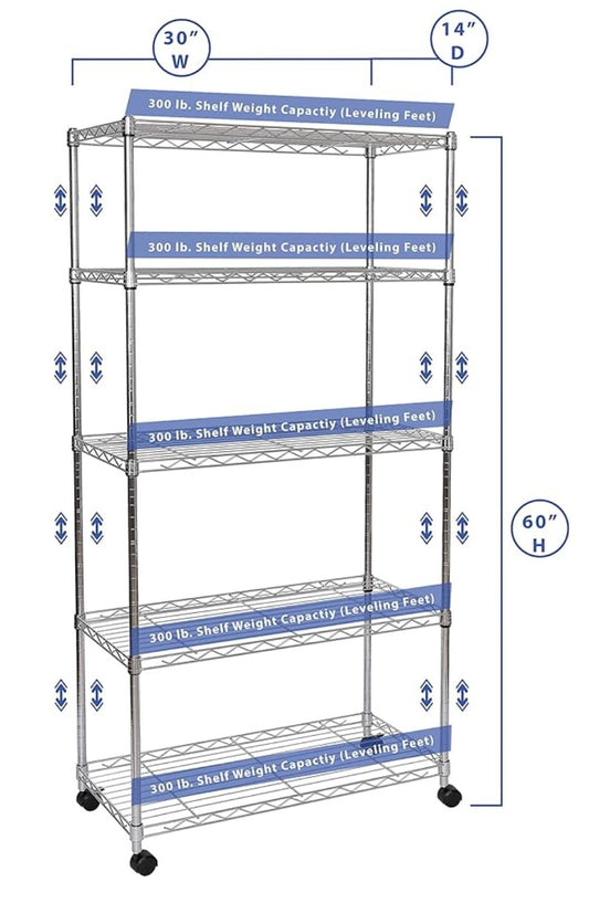 5-Tier Wire Shelving with Wheels, 5-Tier, 30"" W x 14"" D (NEW MODEL), Chrome Plating, Plated Steel